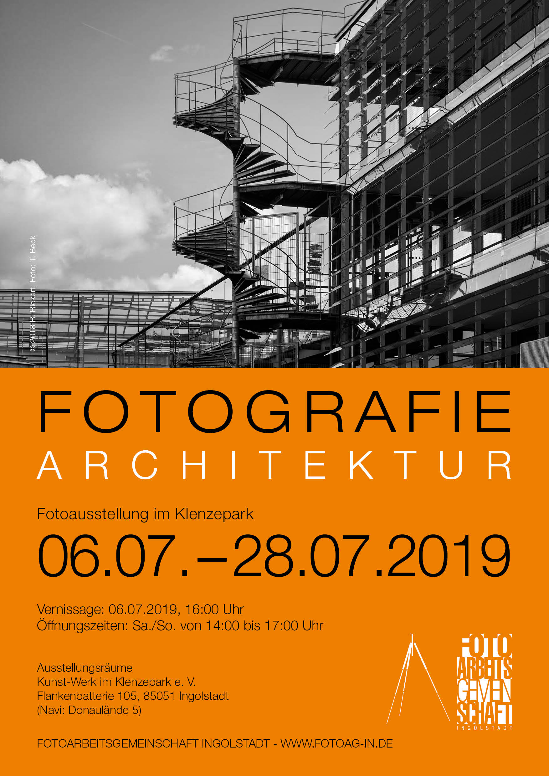 Fotoausstellung im Kunst Werk „Architektur-Fotografie“ Diesen Titel trägt die neue Jahresausstellung der Fotoarbeitsgemeinschaft Ingolstadt. Wir laufen täglich an faszinierenden architektonischen Motiven vorbei. Neben Gebäuden und Räumen zählen Straßen, Brücken, Treppen, Türen, Ornamente und andere Details von Gebäuden zur Architektur-Fotografie. Häufig gehen diese im Alltag verloren und werden nicht wahrgenommen. Deshalb haben die Fotografen in einer Zeit, in der die Sprache des Bildes immer wichtiger wird, ihre eigenen Sehgewohnheiten als medialer Vermittler von Bauwerken, um sie einer breiteren Öffentlichkeit bekannt zu machen. Ausstellungseröffnung im Kunst-Werk, Flankenbatterie 105, am Samstag, 06.07.2019, 16:00 Uhr. Zu sehen ist die Ausstellung im Ausstellungsraum Kunst-Werk im Klenzepark e. V., in der Flankenbatterie 105, in der Zeit von 07.07. bis 28.07.2019 jeweils Samstag und Sonntag von 14 bis 17 Uhr. Der Eintritt ist frei. www.fotoag-in.de